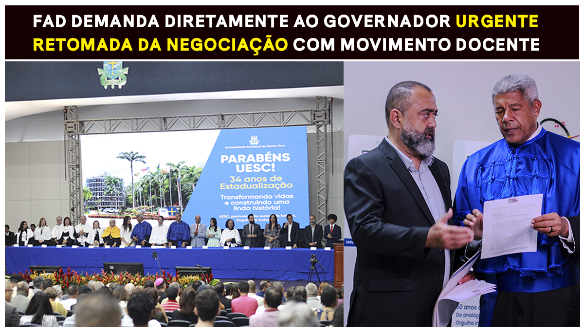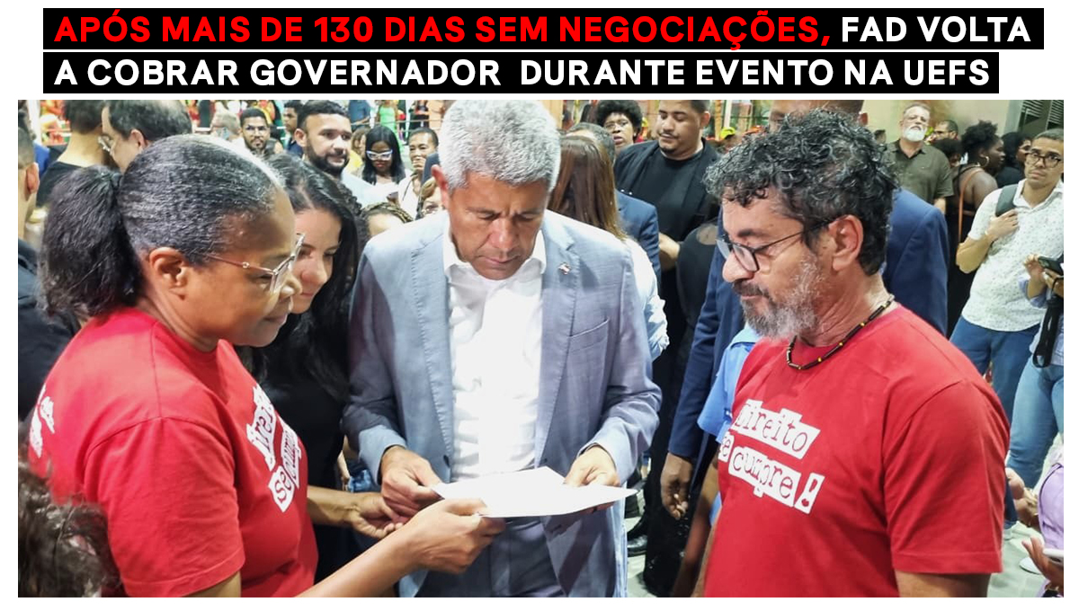 Após mais de 130 dias sem negociações, FAD volta a cobrar governador durante evento na UEFS 12/12/2025 Ascom Fórum das ADs O movimento docente completa mais de 130 dias sem diálogo com o governo, última reunião ocorreu em 29 de julho....