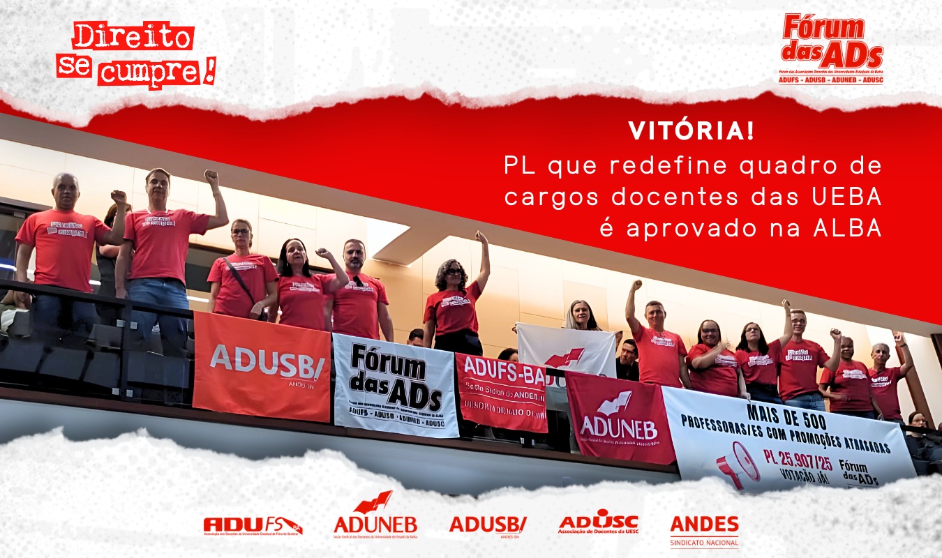 Vitória! PL que redefine quadro de cargos docentes das UEBA é aprovado na ALBA 02/09/2025 FAD Projeto de Lei é fundamental para o destravamento das mais de 500 promoções de professoras e professores...